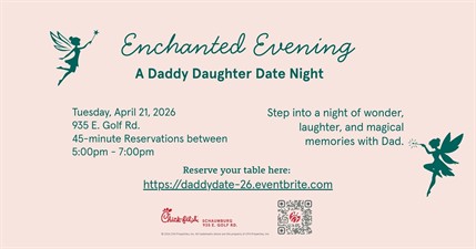 Join us at Chick-fil-A® Schaumburg (935 E. Golf Road) for Enchanted Evening: A Daddy Daughter Date Night on Tuesday, April 21, 2026.