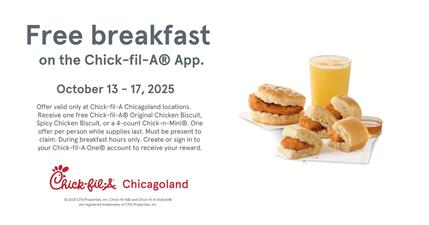 Offer valid only at Chick-fil-A Chicagoland locations. One offer per person while supplies last. Must be present to claim. During breakfast hours only. Create or sign in to your Chick-fil-A One® account to receive your reward.
