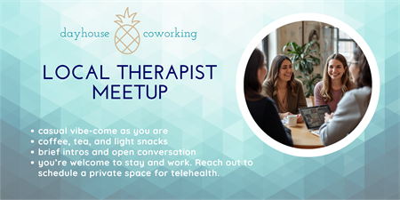 We're welcoming local therapists to connect here at Dayhouse with a morning coffee meetup. Brief intros. Casual vibe. Coffee, tea, and light snacks. Everyone is welcome to stay and cowork until 5pm. Contact Community Manager, bridget@dayhousecoworking.com to schedule a private space for telehealth appointments.