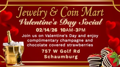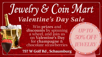 Join us on Valentine's Day and enjoy complimentary champagne and chocolate covered strawberries. Also try your luck and spin a prize wheel to save up to 50% on all jewelry purchases.